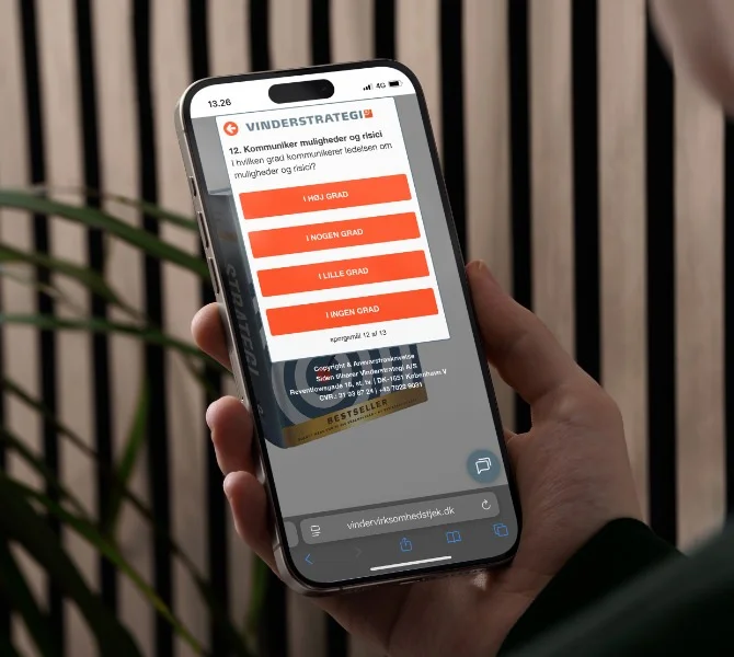 Vi anbefaler at flere personer fra virksomhedens topledelse gennefører VindervirksomhedsTjek® for at sikre et mere nuanceret billede af virksomhedens strategisk arbejde. Efter endt besvarelse vil rapport blive sendt på mail til brug for virksomhedens videre strategiske drøftelser. Oplysningerne behandles fortroligt.